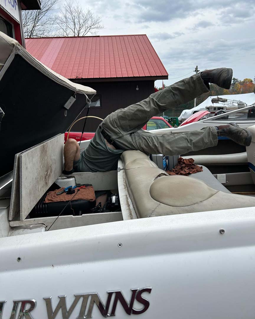 Outboard Engine Includes: Change gear oil, fog cylinders, change oil and filter, add fuel stabilizer, disconnect batteries, pressure checking, grease fittings, and pivot points. No loose engines over 15HP – engines over must be on a boat